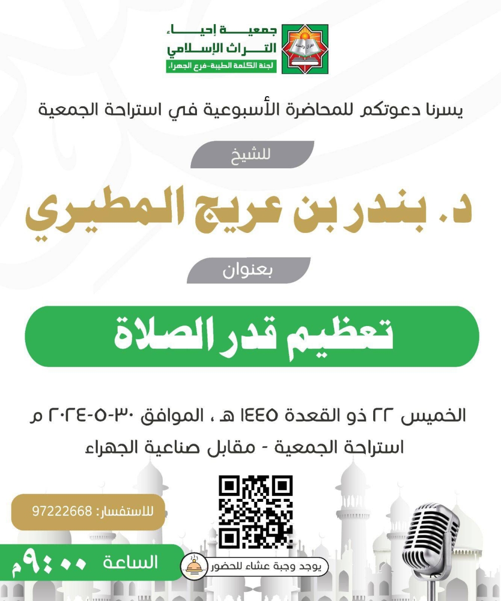 تقيم جمعية إحياء التراث الإسلامي، اليوم، محاضرة بعنوان «تعظيم قدر الصلاة» يحاضر فيها د. بندر المطيري في منطقة الجهراء باستراحة الجمعية مقابل صناعية الجهراء.