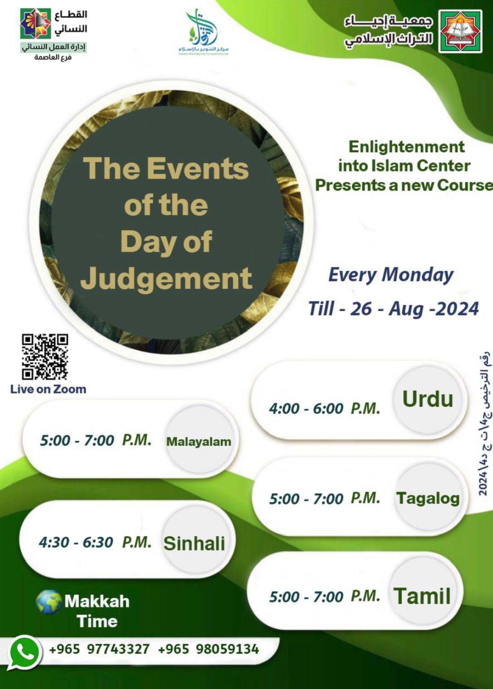 تنظم جمعية إحياء التراث الإسلامي دورة للجاليات النسائية بعنوان «حقائق اليوم الآخر» بخمس لغات، منها الأوردية والتجالوجية، والتاميلية، والمالايالمية، والسنهالية، وذلك يوم الاثنين المقبل.