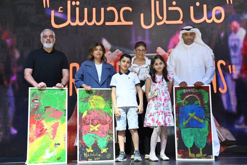 ثم بدأ الحفل الذي اتسم بالبساطة مع التركيز على الهدف الأساسي منه، بالوقوف دقيقة صمت حداداً على أرواح شهداء فلسطين، ثم بالسلام الوطني الكويتي، ثم تلاه الفلسطيني، بعد ذلك تم تكريم أعضاء لجنة التحكييم من خلال منحهم لوحات حنظلة الذي يعبّر عن رمز الصمود للقضية الفلسطينية رسمت بأنامل أطفال كويتيين من مخيم لابا الشتوي، وتم تسليمها لهم بحضور طفلين آتيا قبل أيام قليلة فقط من غزة.