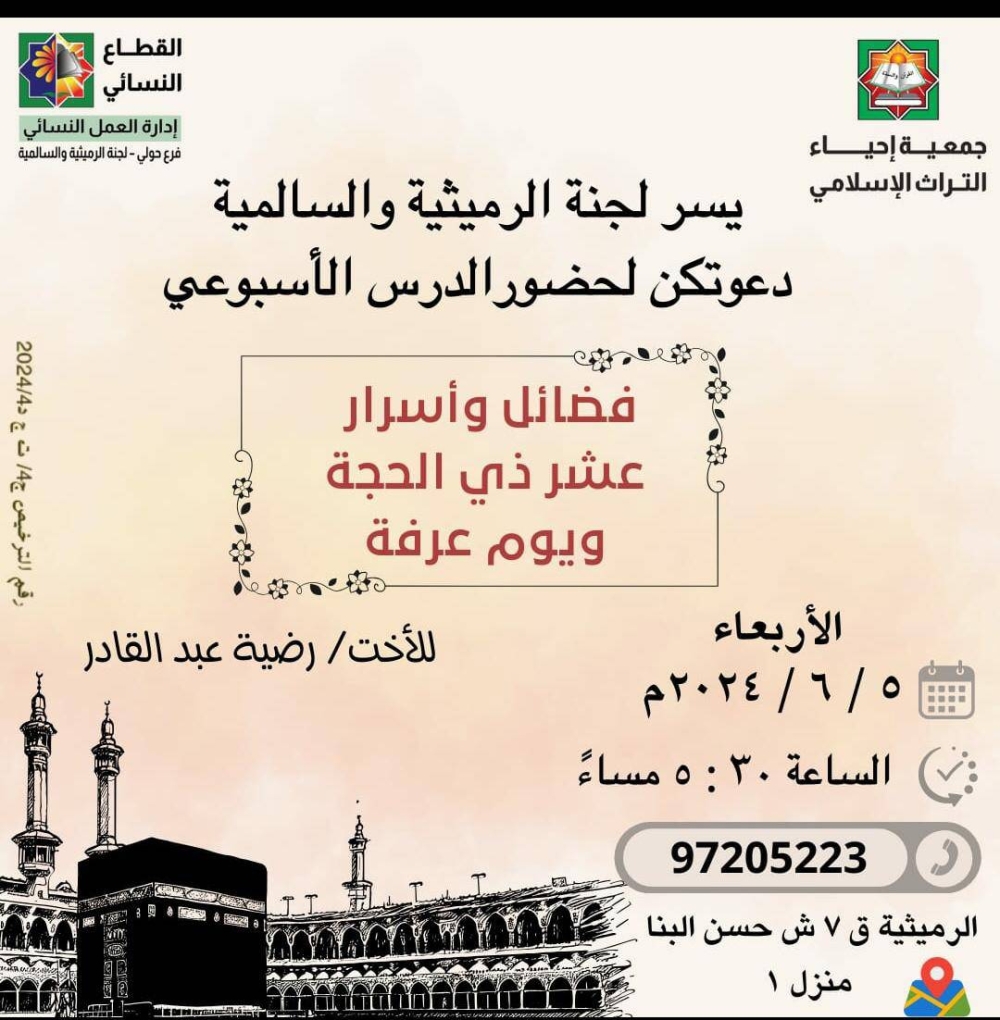 وأشارت الجمعية، في بيان، إلى أن القطاع النسائي ينظم، مساء اليوم، محاضرة بعنوان «فضائل وأسرار عشر ذي الحجة ويوم عرفة»، تلقيها رضية عبدالقادر بمنطقة الرميثية.