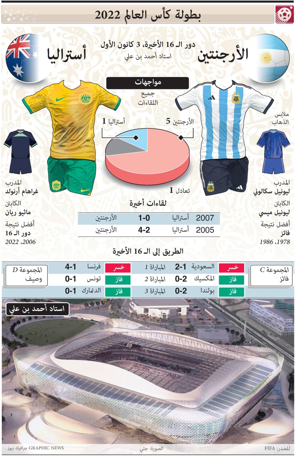 يصطدم المنتخب الأرجنتيني بنظيره الأسترالي غداً السبت في دور الـ 16 من مونديال قطر 2022.