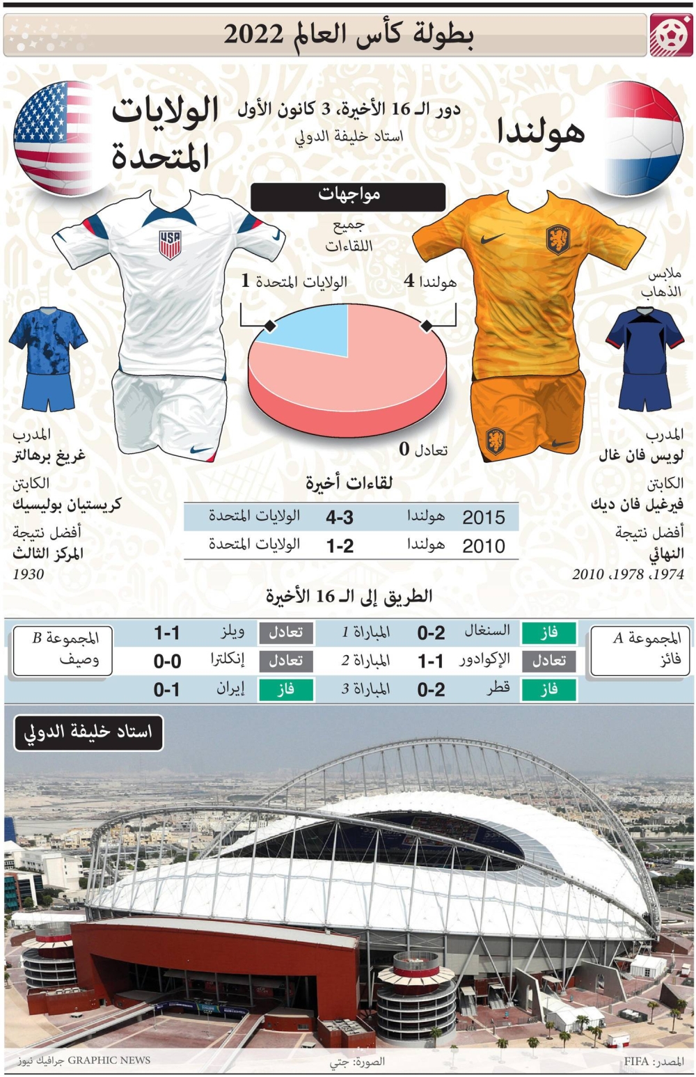 يواجه المنتخب الهولندي، الذي تصدّر المجموعة الأولى، نظيره المنتخب الأميركي، الذي احتل وصافة المجموعة الثانية، اليوم، على استاد خليفة الدولي في دور الـ 16 من مونديال قطر 2022.