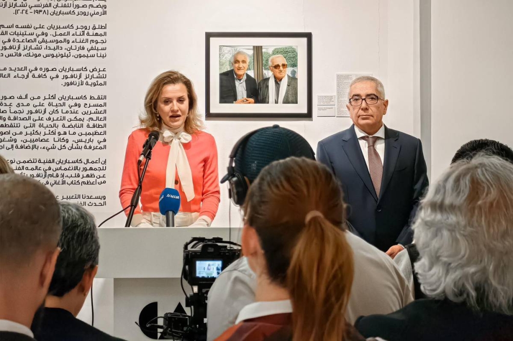 واستدركت: «اليوم، نحن هنا أيضا للاحتفال بفن روجيه كاسباريان، الذي رأينا صوره في هذا المعرض لتكون شاهدا في الوقت المناسب على روح أزنافور وإرثه، ورغم حزننا لوفاة كاسبريان أخيرا، لكنه يشرفنا أن تكون ابنته، ليديا كاسباريان، معنا الليلة، فحضورها بمنزلة تذكير مؤثر بالعلاقة الدائمة بين بلدينا العظيمين والإعجاب المشترك الذي نكنه لشارلز أزنافور».