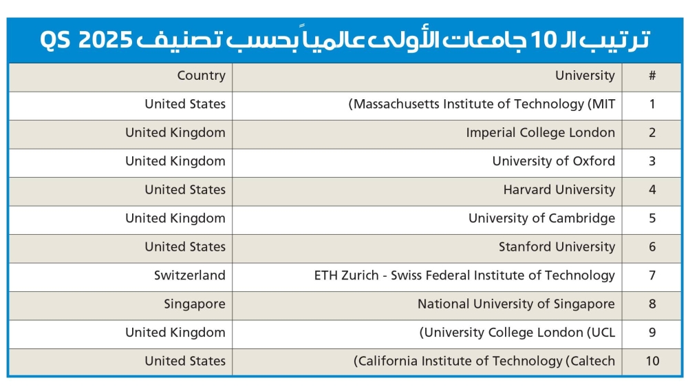 ويشمل تصنيف «QS» ترتيب أفضل 1500 جامعة مصنّفة من 105 دول حول العالم، حيث حافظ معهد ماساتشوستس للتكنولوجيا (MIT) في الولايات المتّحدة على مركز الصدارة في لائحة ترتيب الـ 10 جامعات الأولى عالمياً.