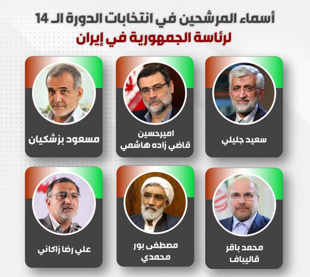 وقال المتحدث باسم لجنة الانتخابات التابعة لوزارة الداخلية إن «المرشحين الذين تم تأييد أهليتهم لخوض الانتخابات هم مسعود بزشكيان ومصطفى بورمحمدي وسعيد جليلي وعلي رضا زاكاني وأمير حسين قاضي زادة ومحمد باقر قاليباف».