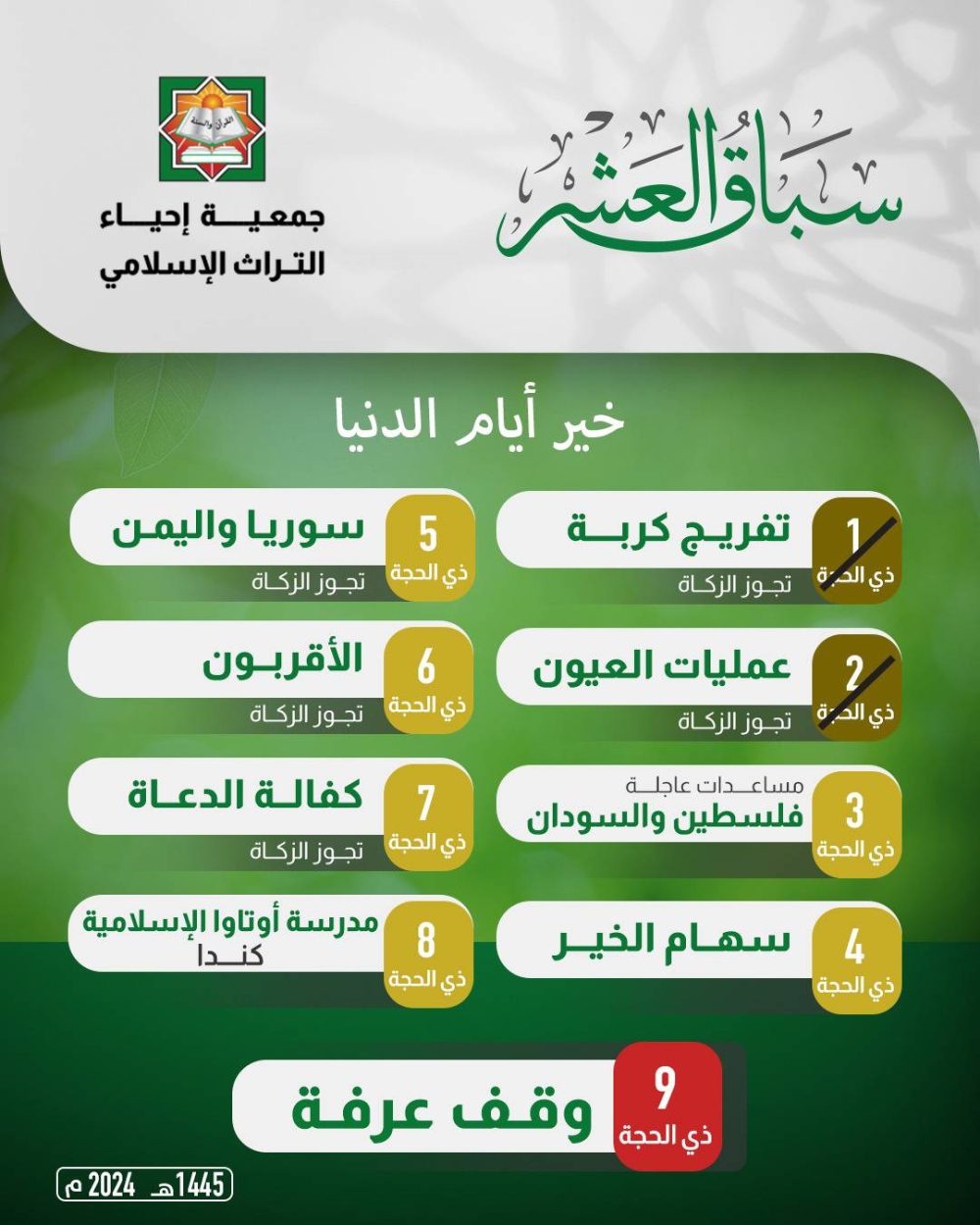 أطلقت جمعية إحياء التراث الإسلامي حملة لتنفيذ مشاريع خيرية داخل الكويت وخارجها، تحت شعار «سباق العشر» لاغتنام أيام العشر من ذي الحجة التي تتضاعف فيها الأجور والحسنات.