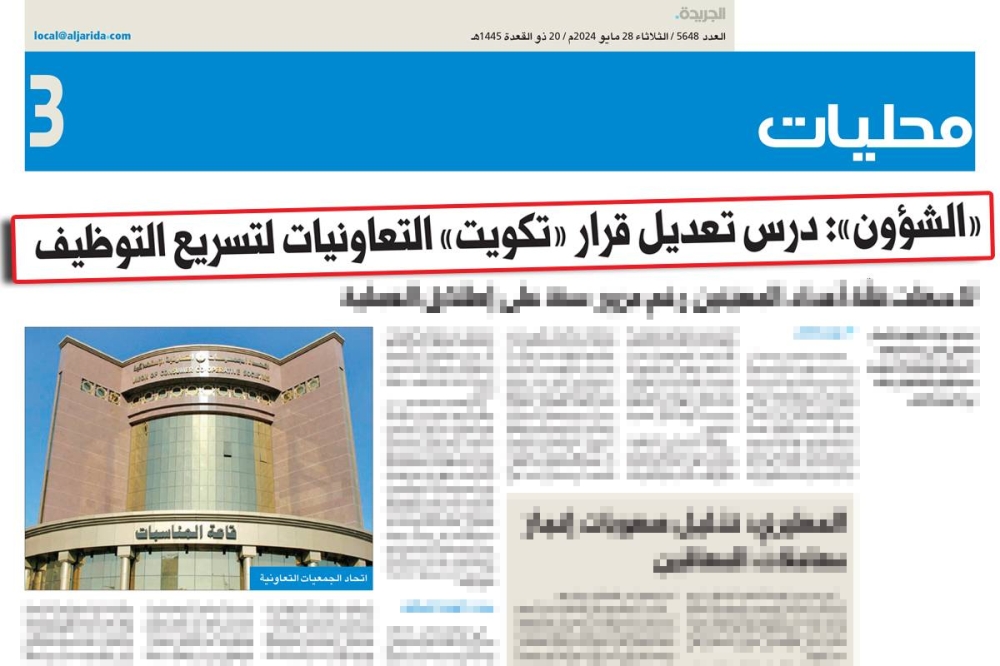 تأكيداً لخبر «الجريدة» المنشور في عددها الصادر، 28 مايو الماضي، بعنوان («الشؤون»: درس تعديل قرار «تكويت» التعاونيات لتسريع التوظيف)، («الشؤون»: درس تعديل قرار «تكويت» التعاونيات لتسريع التوظيف)، والتي أكدت خلاله أن «الوزارة لاحظت قلّة بأعداد المواطنين الذين التحقوا فعلياً بالجمعيات وصدرت لهم قرارات توظيف، رغم مرور ما يزيد على العام منذ صدور القرارين الخاصين بالتكويت وإطلاق عملية التعيين»، أصدر وكيل وزارة الشؤون الاجتماعية بالإنابة د. خالد العجمي، قراراً إدارياً قضى بتجديد أعمال اللجان الخاصة بتنفيذ خطة تكويت الوظائف الإشرافية في الجمعيات التعاونية، على أن تبدأ عملها فوراً بمشاركة الجهات المختصة وذات الصلة.