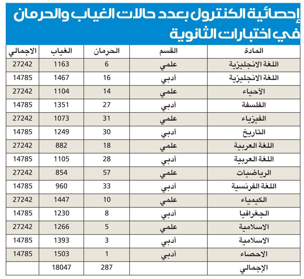وأشارت إلى أن عدد الطلبة المتغيبين في اختبار الجغرافيا بلغ 1447، فيما سجلت حرمان 8 طلاب، وبلغ عدد المتغيبين في مادة الكيمياء 1230 طالبا، في حين سجلت 10 حالات حرمان، فيما بلغ عدد المتغيبين في اختبار مادة الإسلامية 2659 بواقع 1266 في العلمي و1393 بالأدبي، إضافة إلى حرمان 8 طلاب من الاختبارات، نتيجة الغش.