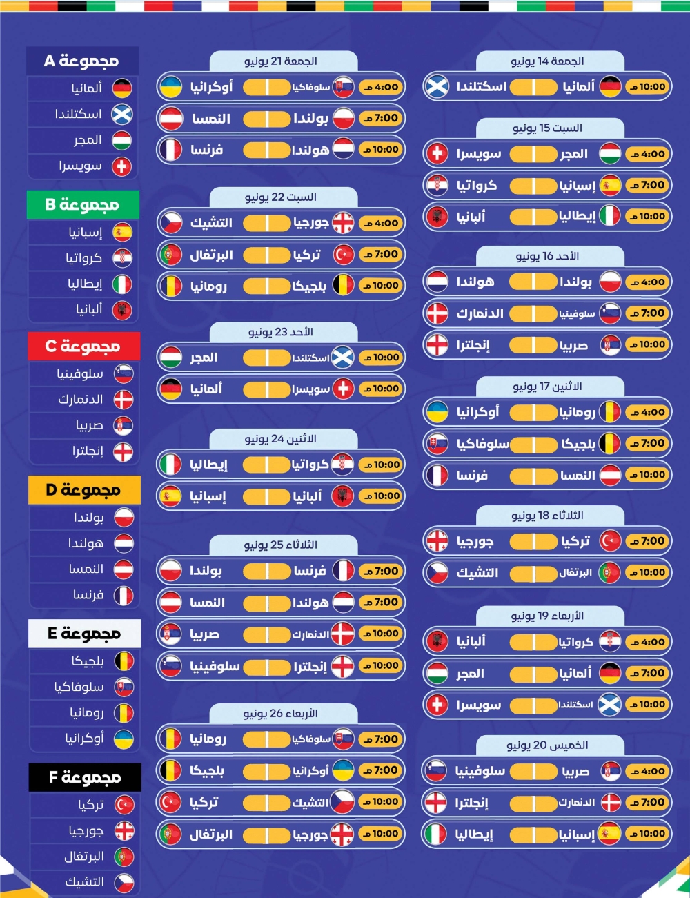 تستهل إنكلترا مشوارها بكأس أوروبا 2024 لكرة القدم في ألمانيا، برداء المرشحة لإحراز لقب قاري أول في تاريخها، عندما تلاقي صربيا، الأحد، في غلزنكيرشن، فيما تُلقي الإصابات بثقلها على مواجهة هولندا وبولندا في هامبورغ.