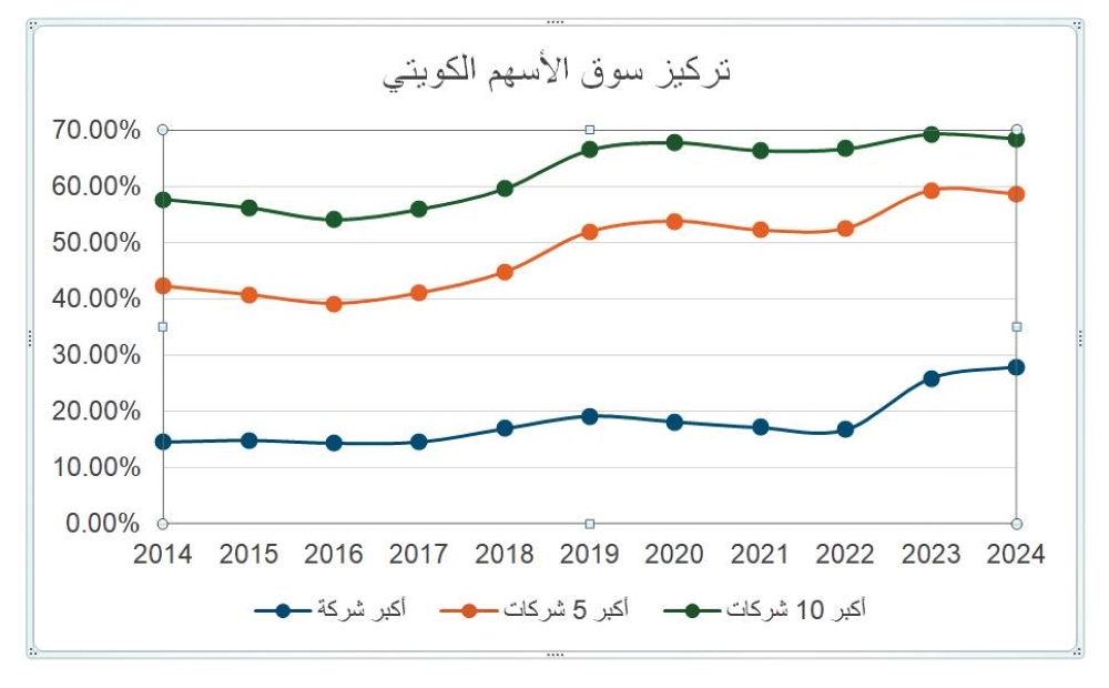 يشهد سوق الأسهم الكويتي وغيره من الأسواق العالمية ظاهرة تركيز الاستثمارات والقيمة السوقية في عدد محدود من الشركات الكبرى، مما يثير تساؤلات حول جدوى إدارة الأموال النشيطة والتأثير على الاقتصاد الكلي، ويعني تركيز سوق الأسهم هيمنة عدد قليل من الشركات على القيمة السوقية الإجمالية للسوق، وبالنظر إلى الرسم البياني المرفق الذي يوضح نسبة أكبر شركة، 5 شركات، و10 شركات من إجمالي السوق الكويتي خلال الفترة من 2014-2024.