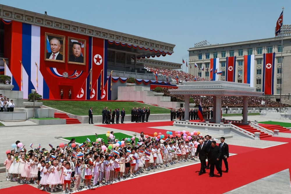 في أول زيارة لكوريا الشمالية منذ 24 عاماً، نقل الرئيس الروسي فلاديمير بوتين، أمس، العلاقات العسكرية مع الزعيم الشيوعي كيم جونغ أون إلى العلن مع توقيعهما «اتفاق شراكة استراتيجية» تشمل الدفاع المشترك في صد أي عدوان خارجي قد يتعرّض له بلداهما.