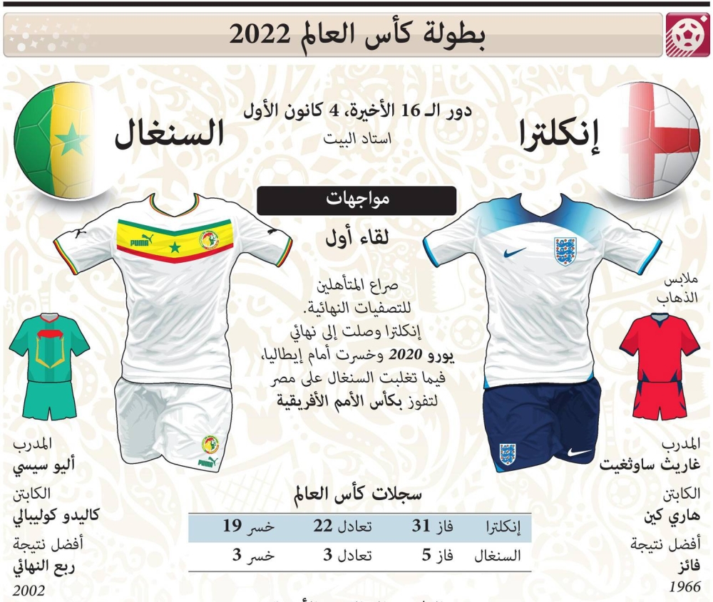ويحلم منتخب السنغال، الذي توج بكأس الأمم الإفريقية لأول مرة في تاريخه مطلع العام الحالي، بإقصاء نظيره الإنكليزي من المونديال، والصعود لدور الثمانية في البطولة، ليكرر الإنجاز الذي حققه في نسخة المسابقة عام 2002.