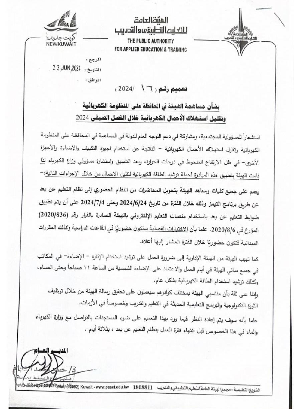 استشعاراً للمسؤولية المجتمعية، ومشاركة في دعم التوجه العام للدولة في المساهمة بالمحافظة على المنظومة الكهربائية وتقليل استهلاك الأحمال خلال هذا الفصل الصيفي، أعلن مدير الهيئة العامة للتعليم التطبيقي والتدريب د. حسن الفجام، تحويل جميع محاضرات كليات ومعاهد الهيئة من النظام الحضوري إلى نظام التعليم عن بُعد عن طريق برنامج التيمز، اعتباراً من الغد حتى 4 يوليو المقبل.