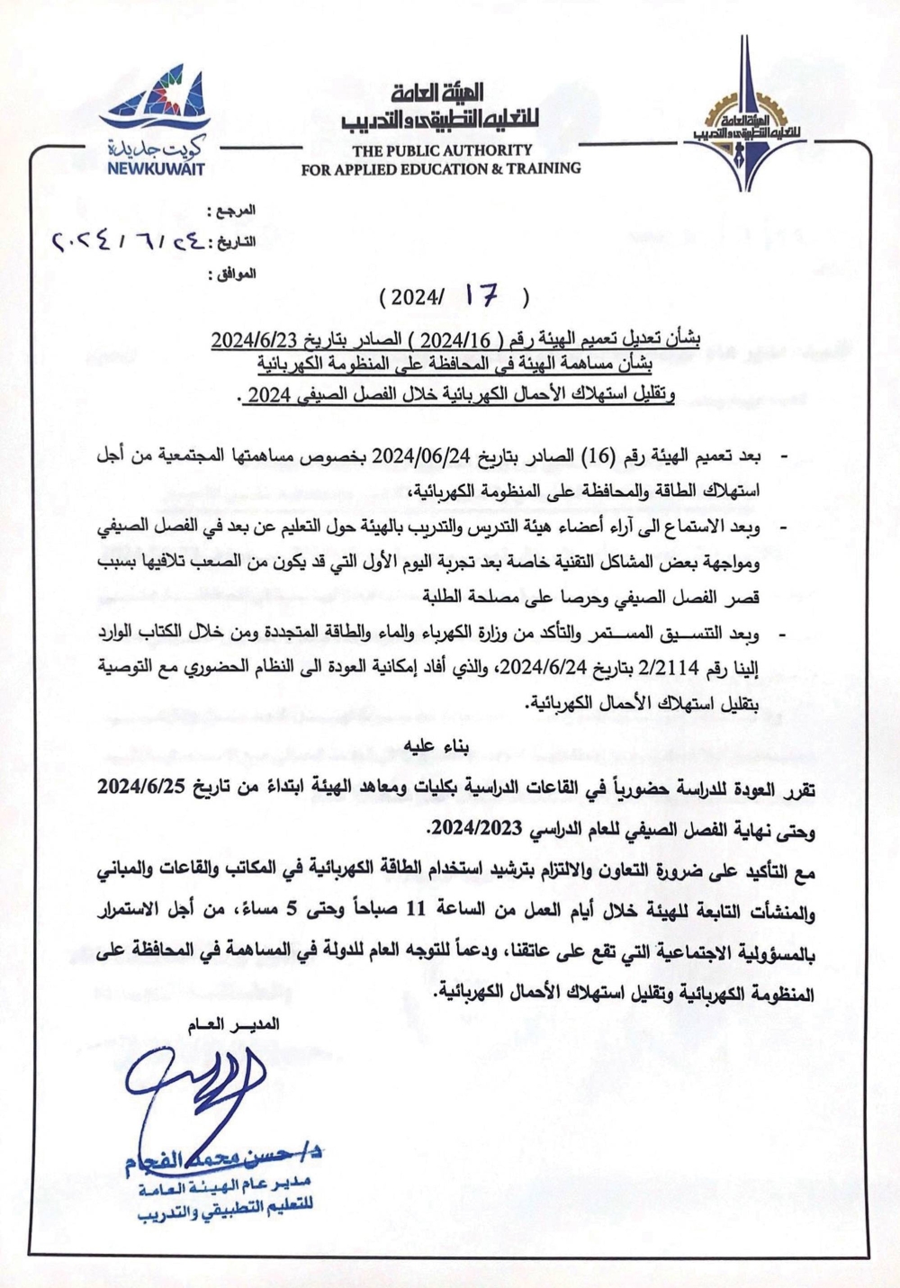 لم يصمد تعميم الهيئة العامة للتعليم التطبيقي والتدريب باعتماد التدريس «أونلاين» خلال الأسبوعين المقبلين، بذريعة تقليل استهلاك الأحمال الكهربائية خلال الفصل الصيفي، غير يوم واحد، إذ أصدر مديرها، د. حسن الفجام، اليوم، تعميماً بتعديل الدراسة واعتمادها حضورياً حتى نهاية الفصل الدراسي الصيفي.