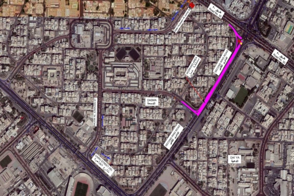 أعلنت هيئة الطرق، بالتعاون مع الإدارة العامة للمرور، عن إغلاق مؤقت للطريق الدائري الثاني، للقادم من طريق الاستقلال (30) والمتجه إلى شارع القاهرة مع مدخل الدسمة، وذلك من فجر الجمعة المقبل حتى فجر السبت 29 الجاري بشكل كامل، على أن يتم إجراء فتح جزئي بعد مدة، والفتح الكامل بعد 48 ساعة.