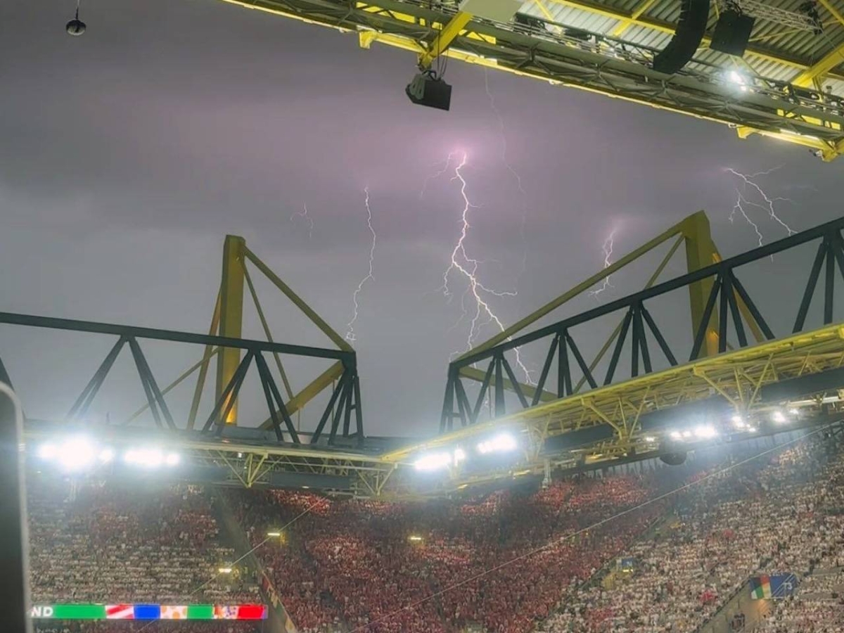 استؤنفت مباراة ألمانيا والدنمارك ضمن الدور ثمن النهائي لكأس أوروبا لكرة القدم في دورتموند التي توقفت بشكل مؤقت عند الدقيقة 35 بسبب عاصفة رعدية قوية تخللها هطول الأمطار والبرد بشكل غزير.
