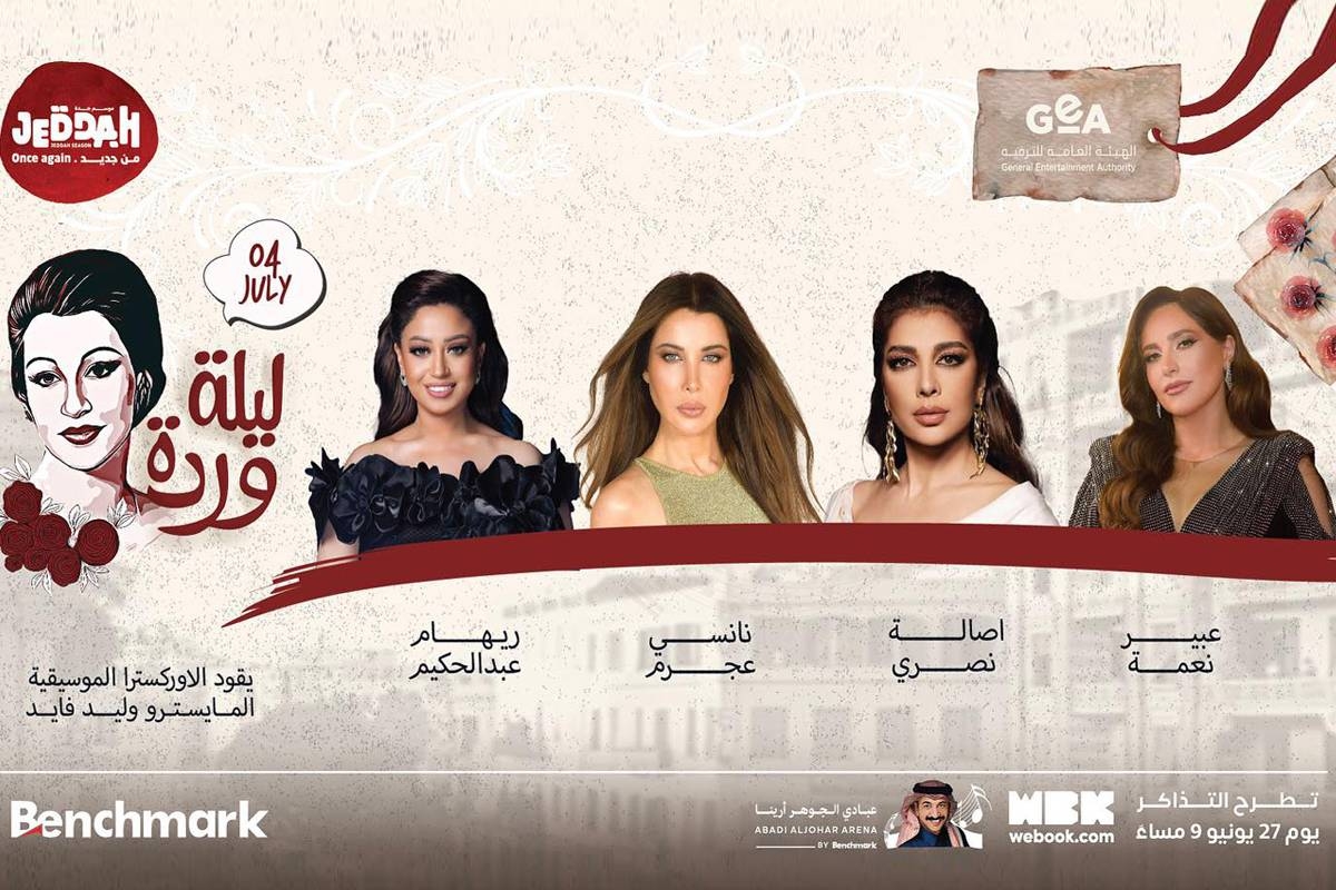 بمشاركة 4 نجمات، تقام «ليلة وردة» في جدة بالسعودية للفنانة الراحلة وردة الجزائرية مع اقتراب ذكرى ميلادها في 22 الجاري.