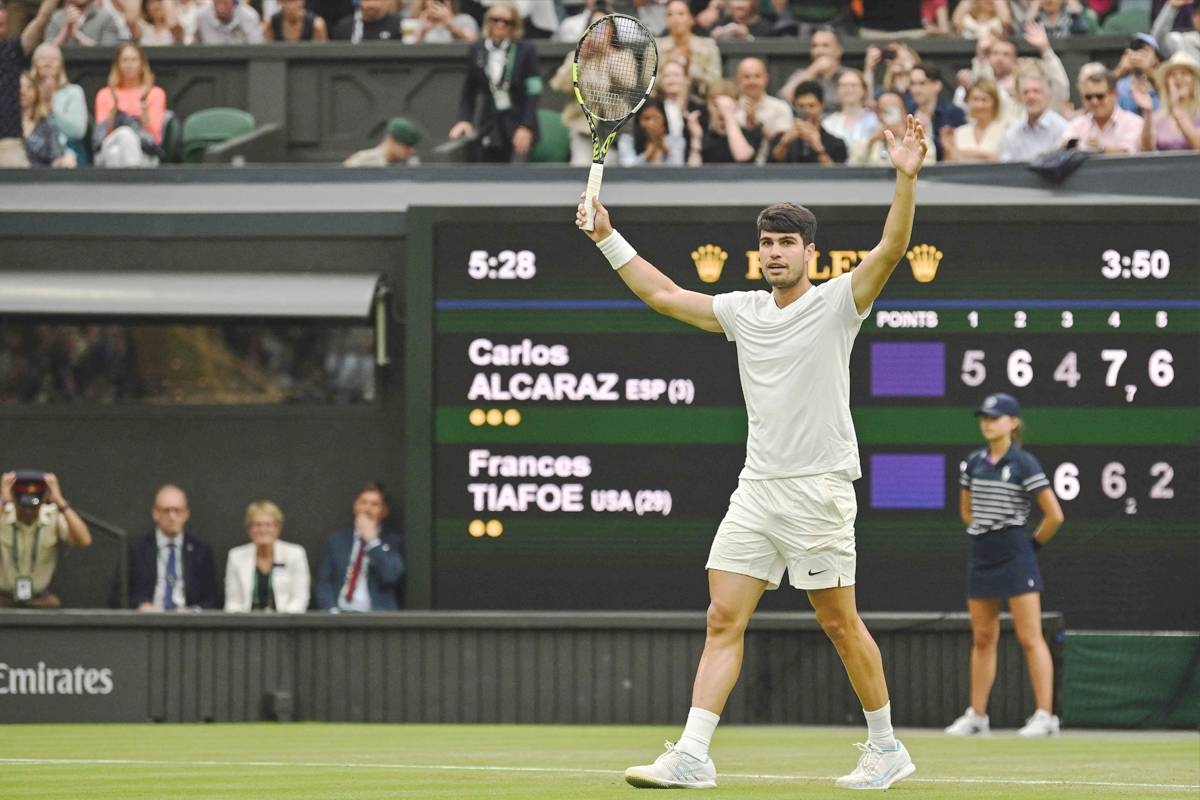 بلغ الإيطالي يانيك سينر، المصنف أول عالمياً، والإسباني كارلوس ألكاراس، حامل اللقب، والمصنف ثالثا، الدور الرابع من بطولة ويمبلدون الإنكليزية، ثالثة البطولات الأربع الكبرى في كرة المضرب، بفوز الأول السهل على الصربي ميومير كيكمانوفيتش 6-1 و6-4 و6-2، والثاني الصعب على الأميركي فرانسيس تيافو 5-7 و6-3 و4-6 و7-6 (7-2) و6-2، في مباراة ماراثونية استمرت 3 ساعات و50 دقيقة أمس الجمعة.