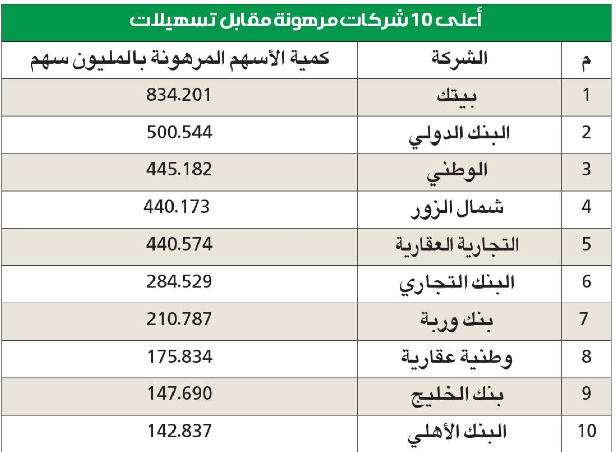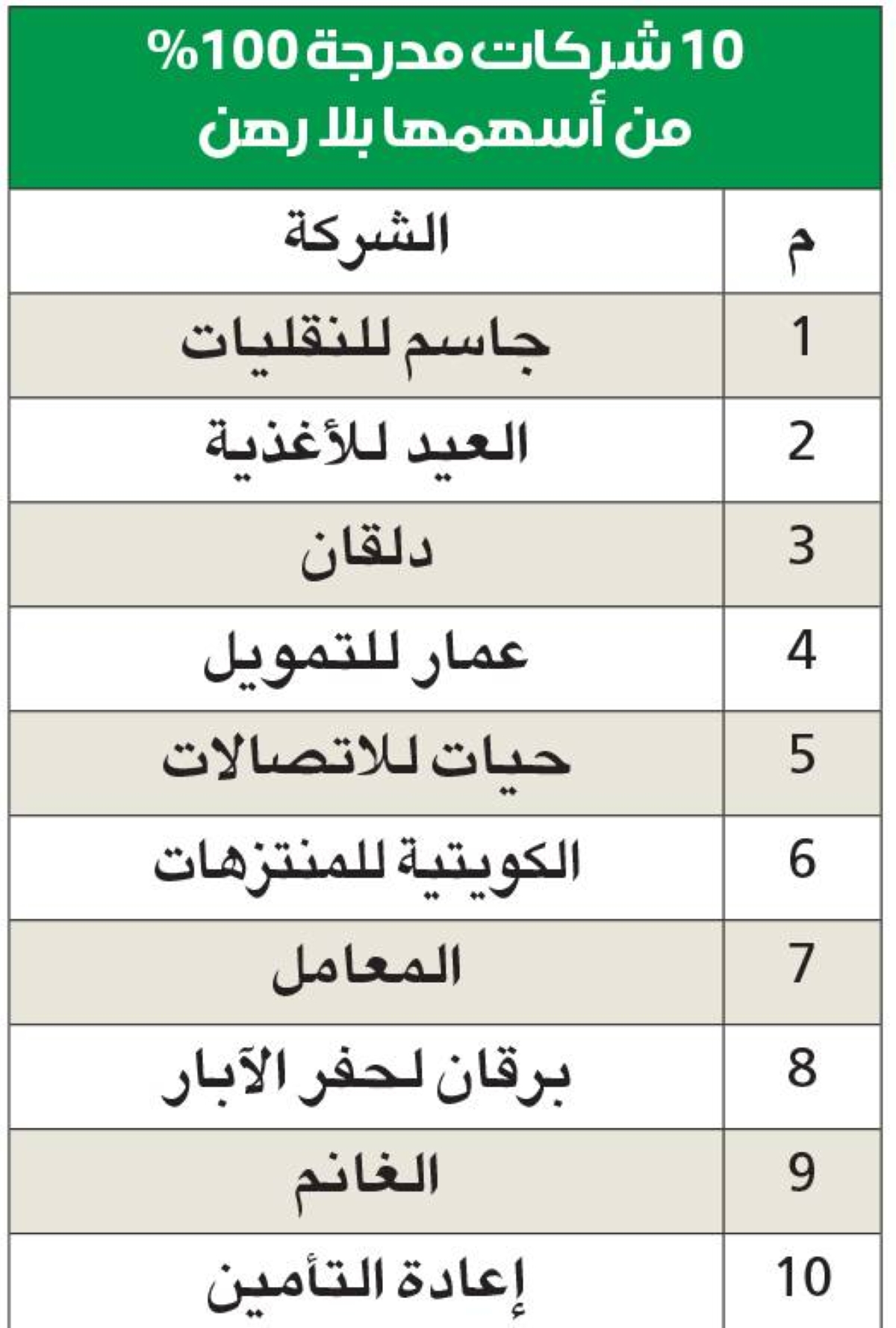 في المقابل، أظهرت بيانات الشركة الكويتية للمقاصة وجود قائمة من الأسهم المدرجة نسبة الأسهم المرهونة لدى البنوك هي «صفر».