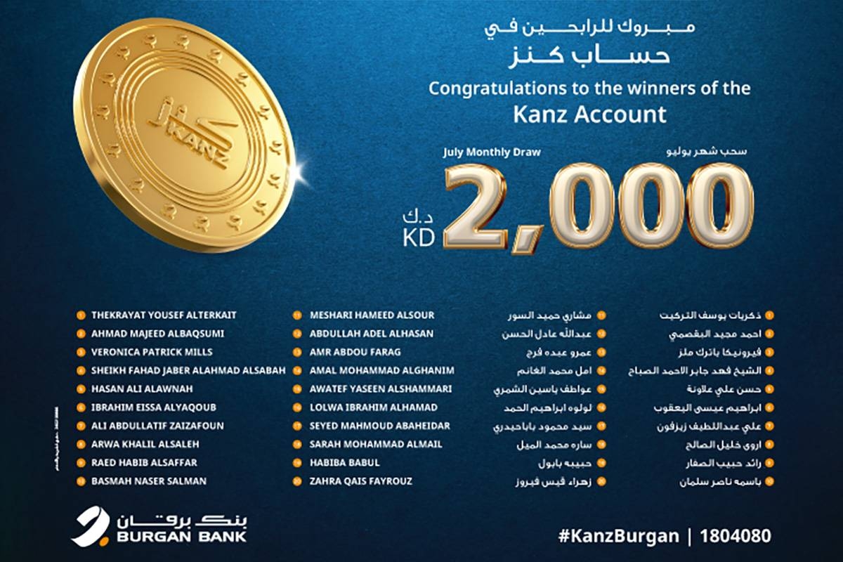 أعلن بنك برقان اليوم عن أسماء العشرون فائز في السحب الشهري لحساب كنز، والذين سيحصل كل منهم على جائزة نقدية بقيمة 2,000 دينار كويتي.