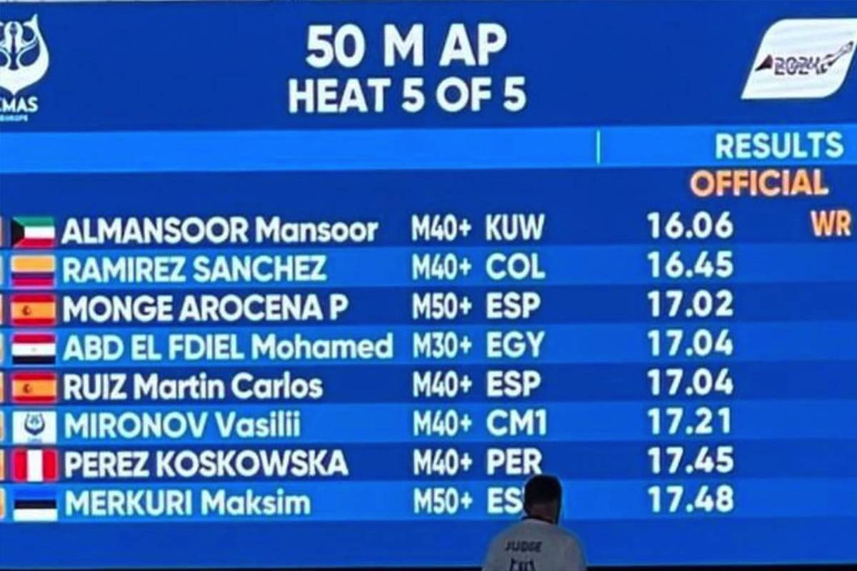 تمكَّن بطل الكويت في سباحة الزعانف منصور المنصور من تحطيم الرقم العالمي بفئة الماسترز وتحقيق الميدالية الذهبية بفئة «50AP»، مسجلاً 16.06 ثانية ضمن منافسات بطولة العالم في العاصمة الصربية (بلغراد).