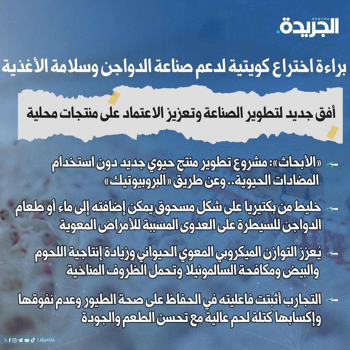 وأكد المعهد أن هذا المشروع يفتح آفاقاً جديدة لتطوير صناعة الدواجن في الكويت وتعزيز الاعتماد على منتجات محلية فعّالة وتقليل الاعتماد على المنتجات المستوردة والمكلفة.