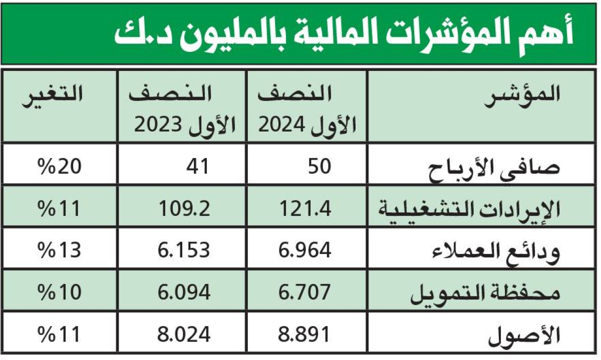 واستعرض الماجد أبرز المؤشرات المالية خلال النصف الأول، حيث زادت أصول البنك إلى 8.9 مليارات دينار، بنسبة نمو 11% مقارنة بالعام السابق، كما بلغت محفظة التمويل 6.7 مليارات بنسبة نمو 10%، وبلغت الإيرادات التشغيلية 121.4 مليونا بنسبة نمو 11%، كما ارتفعت الحصة السوقية للبنك من التمويل المحلي إلى 11.7%.