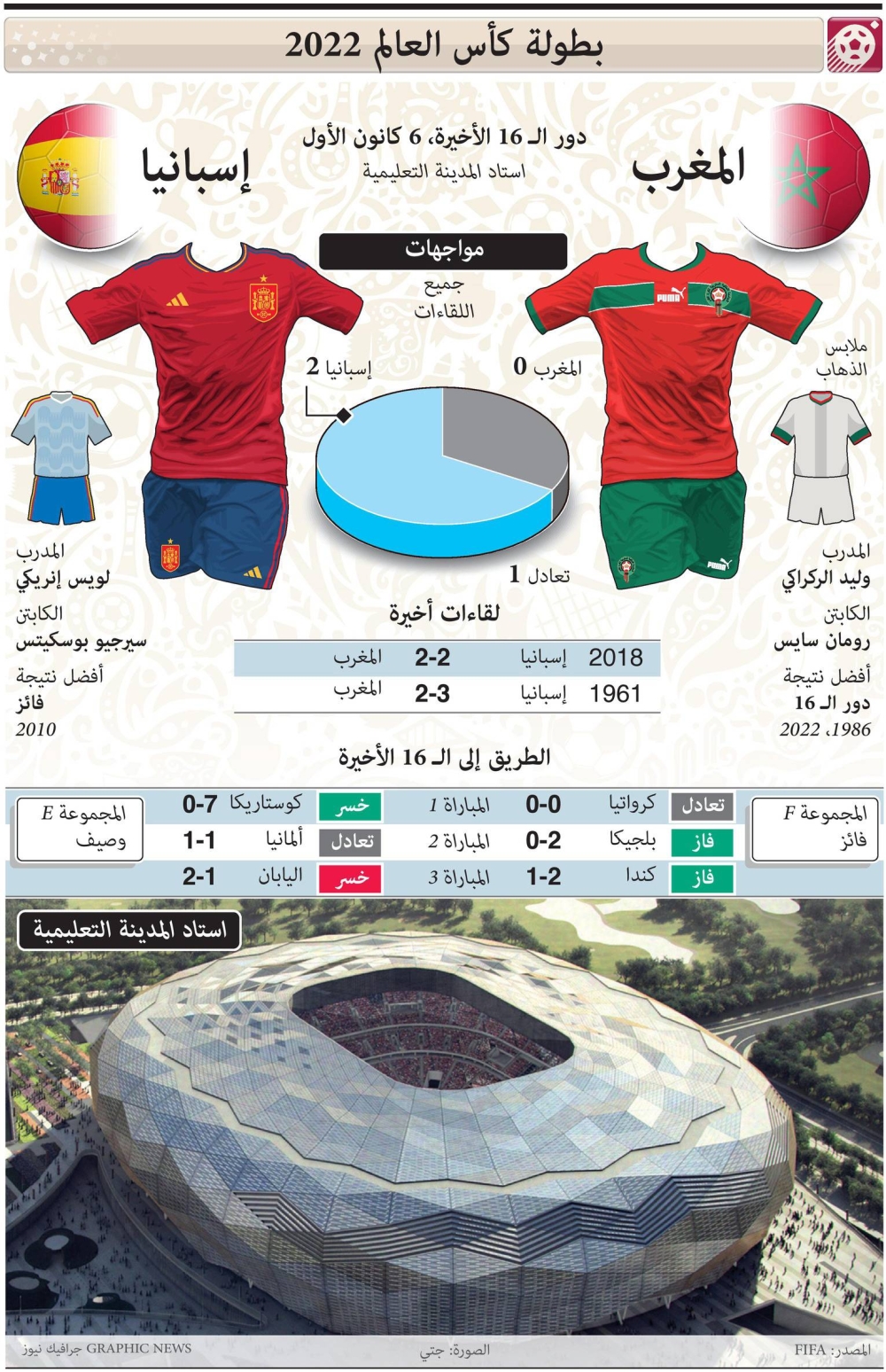 وستكون هذه النسخة الثانية على التوالي التي يلتقي خلالها المنتخبان في كأس العالم، بعد تواجهما في مرحلة المجموعات بالمونديال الماضي في روسيا، حيث اقتنص «الماتادور» تعادلاً مثيراً في اللحظات الأخيرة 2-2.