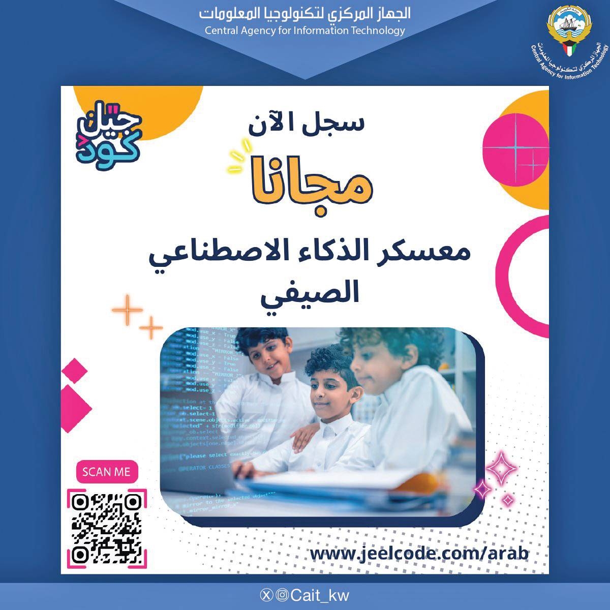 وقال الجهاز، في بيان، اليوم، إن الفئات المستهدفة للمشاركة في المعسكر هم الطلاب من الصف الرابع إلى الصف الثاني عشر، مبيناً أن مدة التدريب 4 أسابيع بواقع لقاءين أسبوعياً، كل لقاء مدته ساعة، على أن تشمل محاور التدريب تطوير تطبيقات الجوال، وتعلم الآلة والذكاء الاصطناعي، والذكاء الاصطناعي التوليدي، ومشروعاً للتخرج.