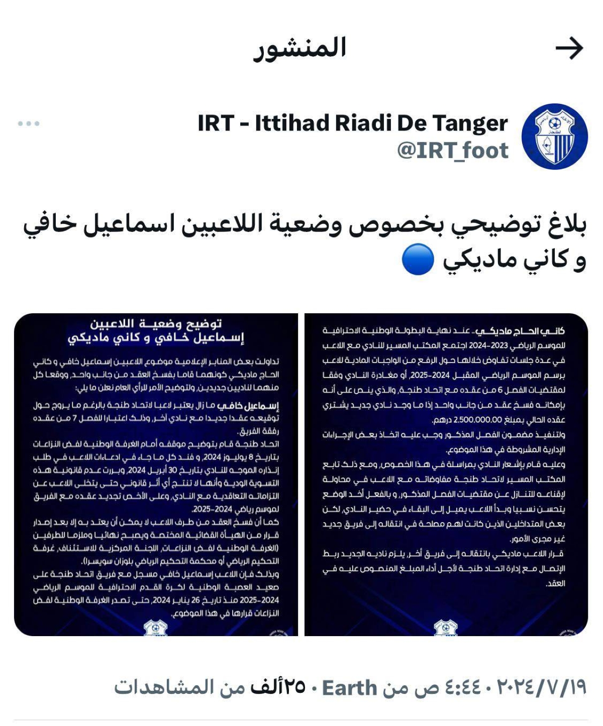 وشدد على أن فسخ العقد من طرف اللاعب لا يمكن أن يعتد به إلا بعد إصدار قرار من الهيئة القضائية المختصة، ويصبح نهائيا وملزما للطرفين، مؤكدا أن اللاعب إسماعيل خافي مسجل مع فريق اتحاد طنجة للموسم الرياضي 2025-2024 منذ 26 يناير 2024، لحين قرار الغرفة الوطنية لفض النزاعات.