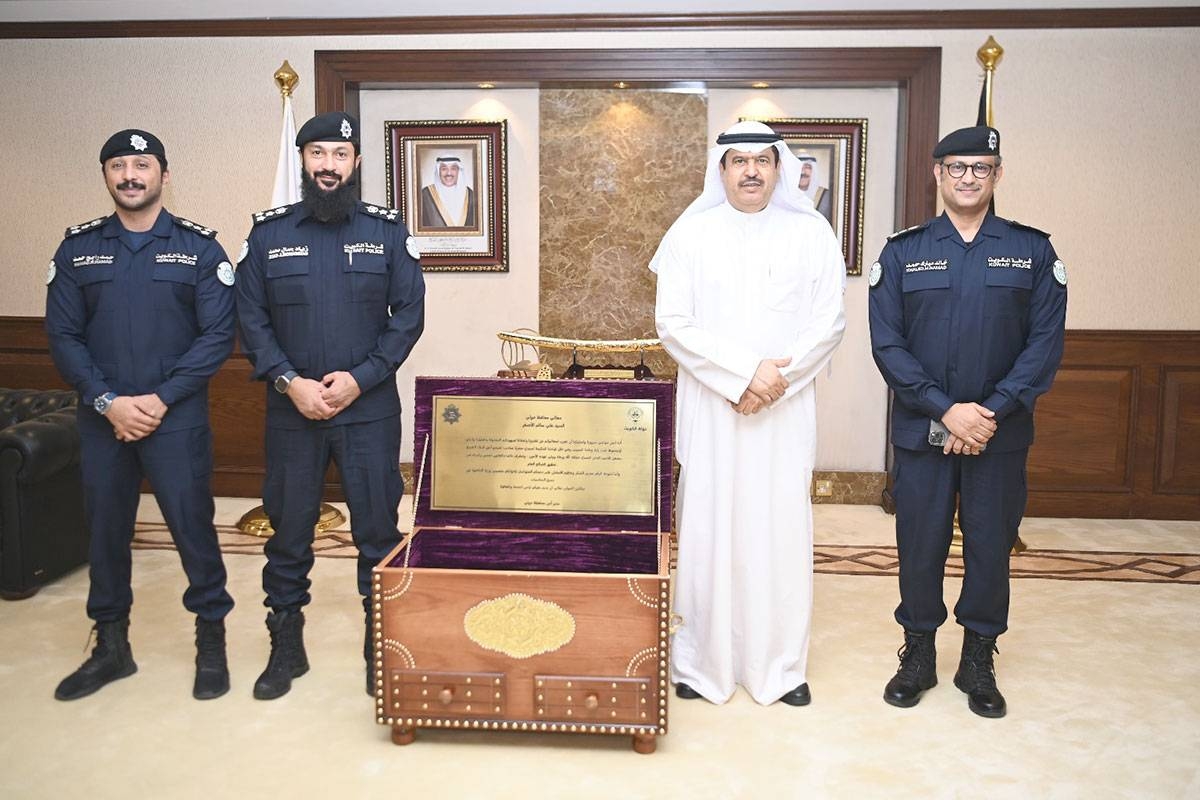 جاء ذلك خلال استقباله في مكتبه بالديوان العام للمحافظة مدير أمن محافظة حولي، العميد زياد الخطيب، ومساعده، العميد خالد الحميدي، ومدير العمليات والدوريات في المحافظة، العميد حمد الزوير، حيث قدموا له درعاً تذكارية، تقديراً لدوره الكبير والدعم وتعزيز التواصل مع مديرية الأمن.