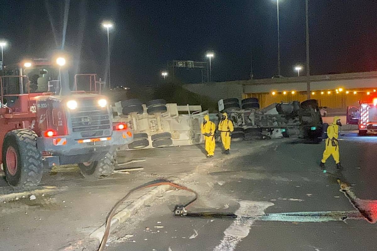 تعاملت فرق الإطفاء، عصر اليوم الإثنين، مع حادث إنقلاب صهريج مواد كيميائية سعته 6000 لتر، على طريق وصلة الدوحة، مما أدى إلى تسرب المواد على الطريق.