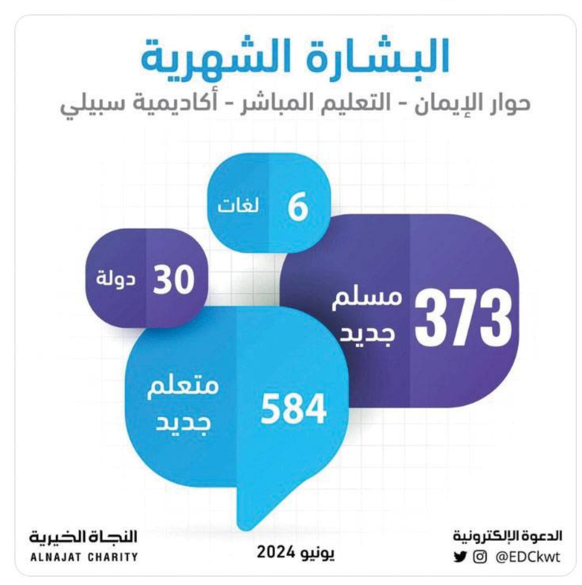 قالت مديرة لجنة الدعوة الإلكترونية التابعة لجمعية النجاة الخيرية، إيمان العلي، إن 373 مهتدياً ومهتدية من 30 دولة حول العالم أشهروا إسلامهم باللجنة خلال شهر يونيو الماضي. وأوضحت العلي، في تصريح صحافي، أن «الدعوة الإلكترونية» تبذل جهوداً حثيثة تجاه تعليم المهتدين الجدد وتوعيتهم، ولديها فصول دراسية تناسب كل الشرائح، ويشرف عليها طاقم مميز من المعلمين المتميزين بشتى اللغات.