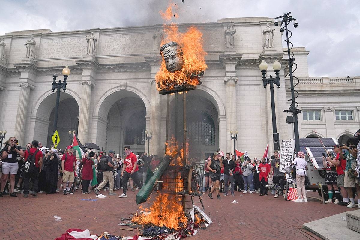 وفي إجماع نادر، ندد الرئيس الأميركي ونائبته كامالا هاريس وخصمهما الجمهوري دونالد ترامب بإحراق المتظاهرين في واشنطن الأعلام الأميركية خلال الاحتجاجات على زيارة نتنياهو وخطابه بالكونغرس.