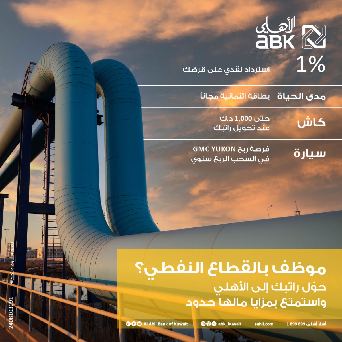 وتتوفر المزايا لجميع العملاء من المواطنين والوافدين الموظفين في قطاع النفط والغاز، وتشمل هدية نقدية لغاية 1000 دينار، وبطاقة فيزا سيغنتشر الائتمانية مجانا مدى الحياة، إلى جانب 1% استرداداً نقدياً على القروض وفرصة للفوز بسيارة جي إم سي يوكون للعملاء خلال السحب ربع السنوي للحملة.