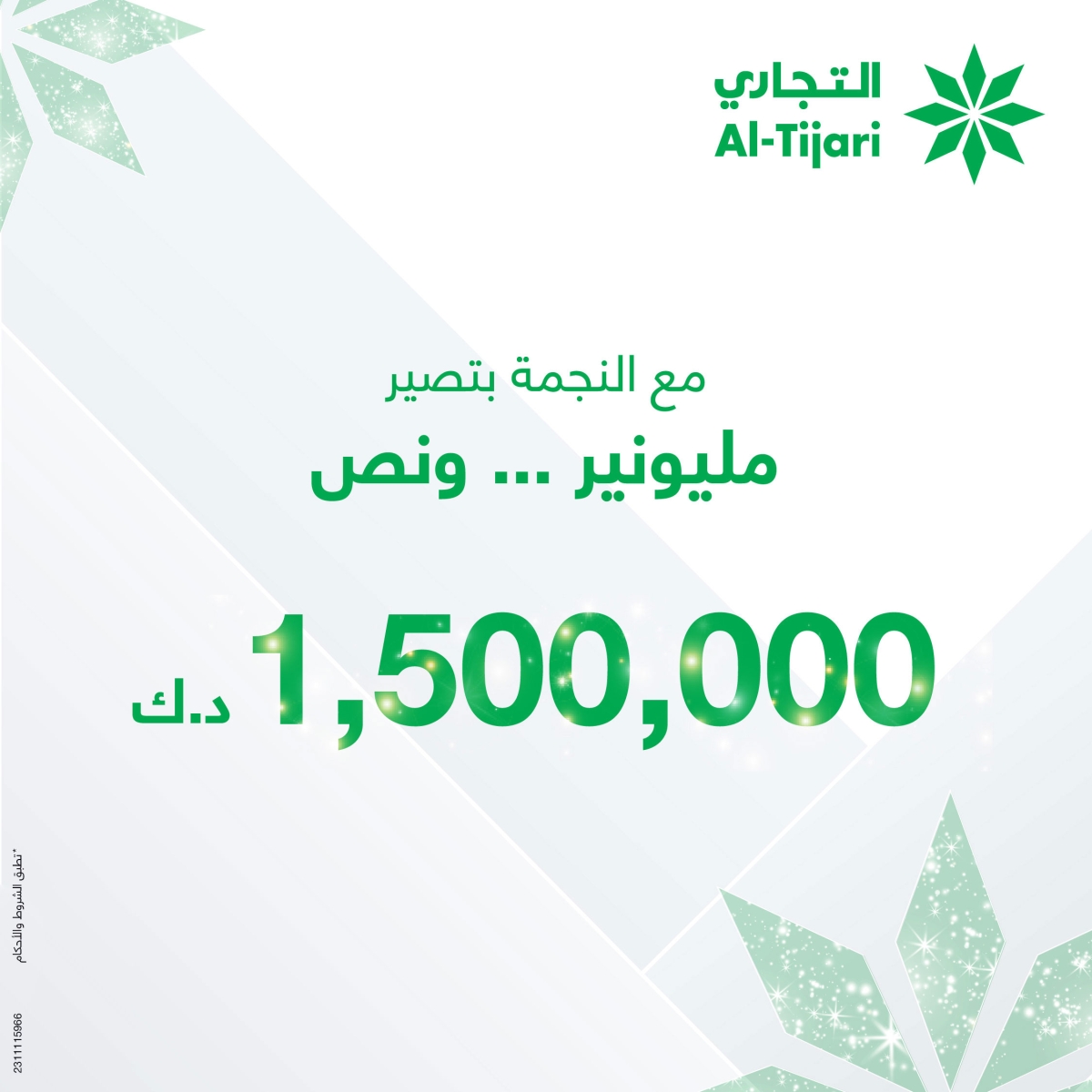 يذكر أن جوائز «حساب النجمة» مميزة بتنوع المبالغ المقدمة طوال السنة، والتي تتضمن سحوبات أسبوعية بقيمة 5000 دينار، وشهرية بقيمة 20 ألفا، إضافة الى جائزة نصف سنوية بقيمة 500 ألف، والجائزة السنوية الكبرى بقيمة 1.5 مليون دينار.