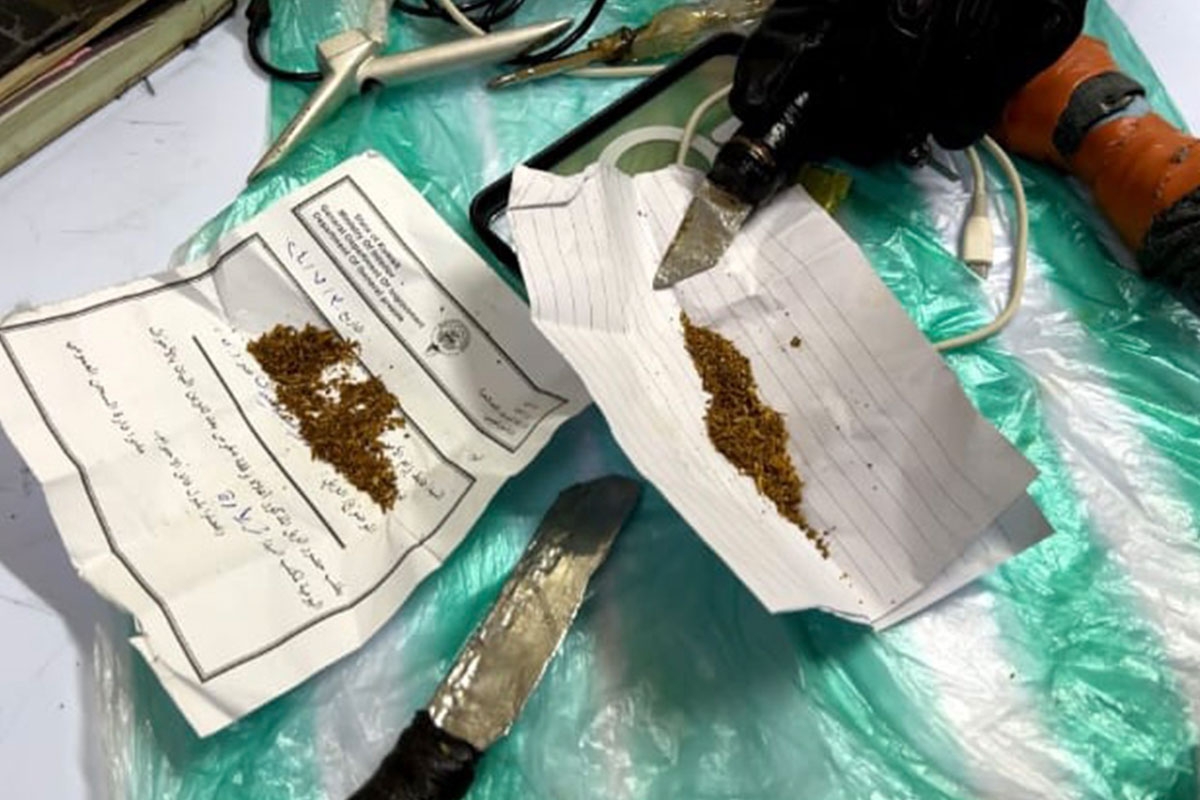 وأضاف المصدر أن القوة الأمنية عثرت على مواد مخدرة وأدوات تعاط وأسلحة بيضاء داخل عنابر سجناء المخدرات كانت مخبأة بأماكن سرية داخل الزنازين، وعثرت أيضاً على أجهزة هواتف نقالة وشرائح اتصال ووايرات شحن الهواتف والسماعات.