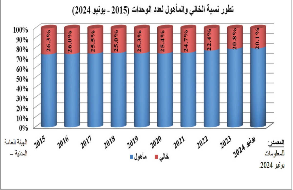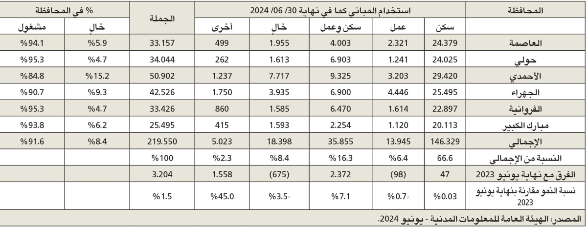 وانخفضت نسبة المباني الخالية خلال الفترة المماثلة وفقاً لبيانات الهيئة العامة للمعلومات المدنية، إذ بلغت نسبتها نحو 8.4% وعددها نحو 18.4 ألف مبنى من إجمالي 219.6 ألفاً، مقارنة بنحو 19.1 ألف مبنى خالٍ من إجمالي 216.3 ألفاً في نهاية يونيو 2023، أي ما نسبته 8.8%.