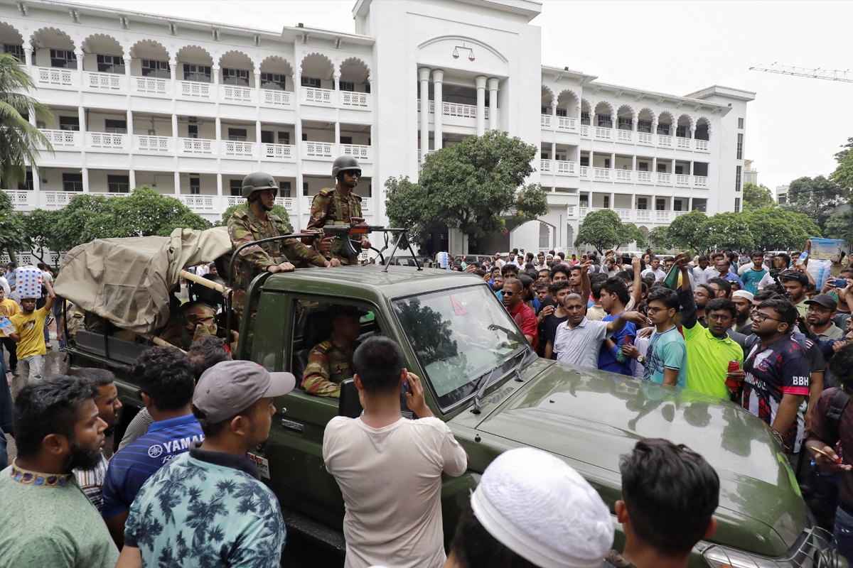 وإن كانت الحشود احتفلت بإطاحة حسينة بعد أسابيع من التظاهرات التي انطلقت كحركة طلابية احتجاجاً على نظام الحصص في الوظائف العامة، فإن العسكريين هم الذين قلبوا الوضع. فقرار الجيش عدم الانضمام إلى الشرطة وغيرها من قوات الأمن في قمع التظاهرات بشدة، مبدلاً موقفه الموالي تماماً لرئيسة الوزراء، هو الذي تسبب في سقوطها.