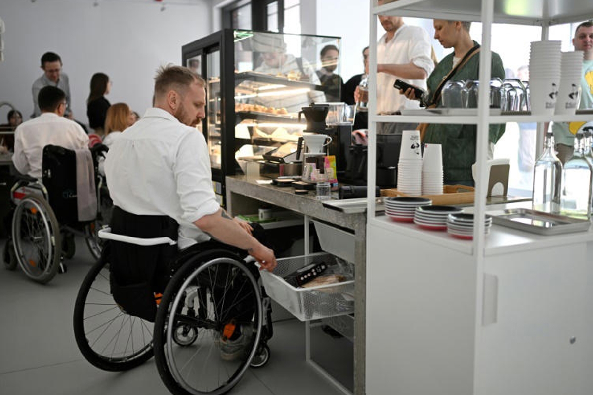 لكن منضدة العمل المنخفضة التي يستطيع ذوو الكراسي المتحركة استخدامها، والملصق الذي كُتِب عليه باللغات البولندية والإنكليزية والبيلاروسية أن «الباريستا (مُعِدّ الفهوة) المناوب ضعيف السمع» يَشِيان بأنه ليس مكاناً عادياً.