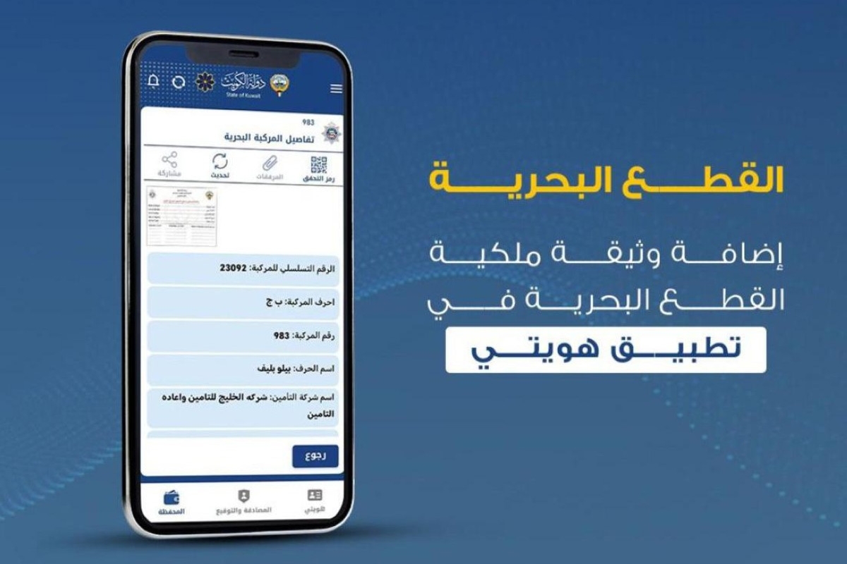 ذكرت الإدارة العامة للعلاقات والإعلام الأمني بوزارة الداخلية أنه ضمن جهود المؤسسة الأمنية للتسهيل على المواطنين واستكمالاً لعملية التحول الرقمي، قامت وزارة الداخلية ممثلة بالإدارة العامة لنظم المعلومات والإدارة العامة لخفر السواحل بالتنسيق مع الهيئة العامة للمعلومات المدنية بإضافة وثيقة ملكية القطع البحرية الإلكترونية في تطبيق «هويتي».