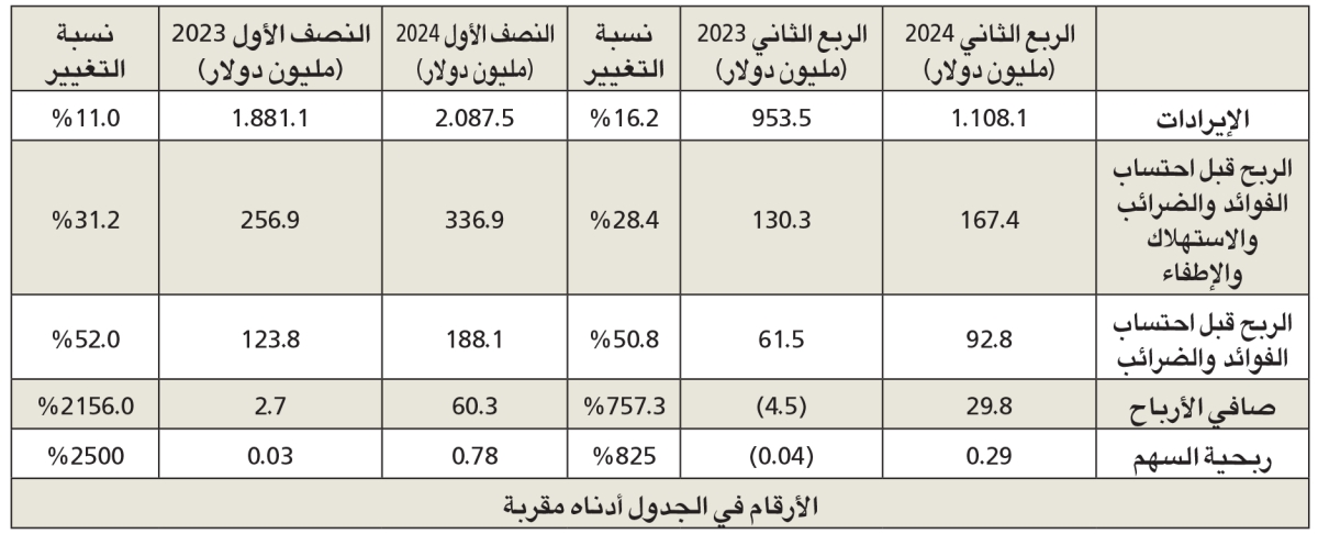 • أرباح الشركة قبل الفوائد والضرائب والاستهلاك والإطفاء ارتفعت بنسبة 28.4 في المئة، لتصل إلى 167.4 مليون دولار. وبلغت نسبة هامش الربح 15.1 في المئة.