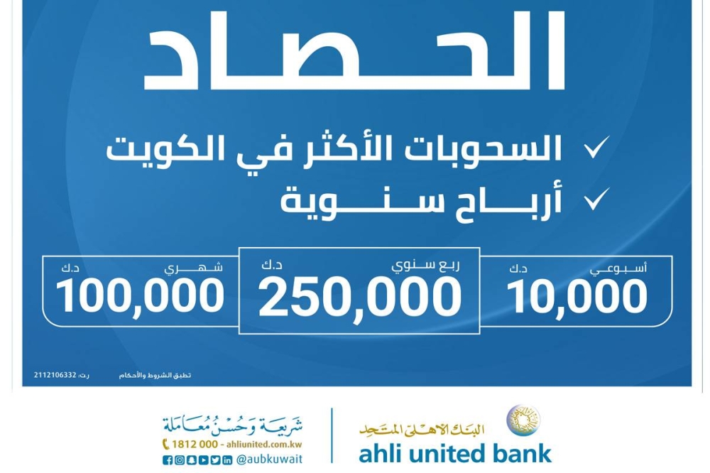ويقدم حساب الحصاد الإسلامي في باقته الجديدة مجموعة أوسع من المزايا، حيث يحظى الرابحون من عملاء المتحد بجائزة شهرية بقيمة 100.000 د.ك. بالإضافة إلى 10 جوائز أسبوعية بقيمة 1.000 د.ك لكل جائزة. وتبقى الجوائز ربع السنوية الكبري بقيمة 250,000 د.ك. نقداً للرابح هي أهم ما يطمح إليه العملاء، حيث تمثل لهم فرصة حقيقية لتحقيق حلم العمر.