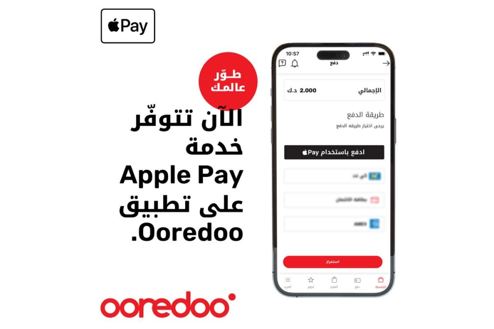 وتفخر Ooredoo الكويت بأن تكون أول شركة اتصالات في الكويت تعلن إطلاق خدمة Apple Pay عن طريق تطبيق MyOoredoo الخاص بها لتواكب شعارها «طور عالمك»، وبذلك تكون سباقة في تقديم هذه الخدمة التي طال انتظارها بشكل يوفر لعملائها سهولة إجراء العمليات المالية الفردية اليومية من دون أي تعقيدات.