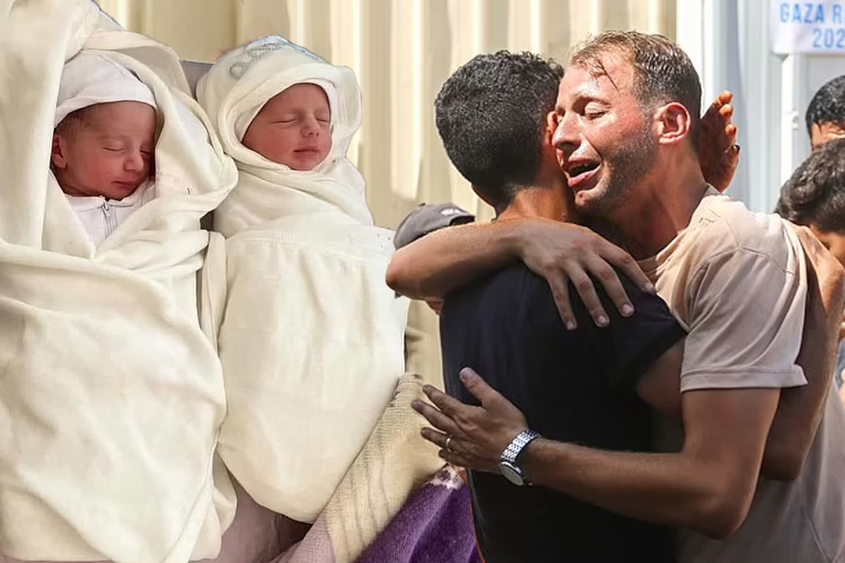 تُظهر اللقطات الأب بينما آخرون يواسونه في المستشفى وهو يرفع شهادات ميلاد التوأم بالدموع.