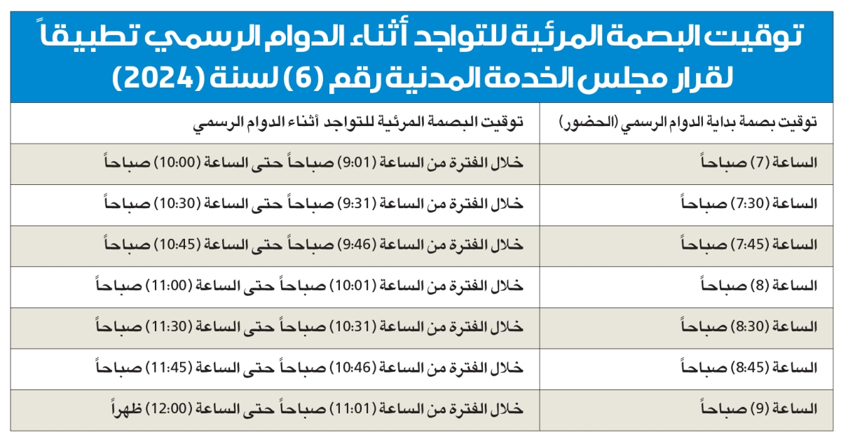 وحدد الديوان مواعيد تلك البصمة حسب أوقات الحضور لكل جهة، داعياً الجهات التي تطبق أنظمة تستخدم تطبيقات الهاتف الذكي في إثبات الحضور والانصراف، إلى تفعيل النظام، ليشمل البصمة المرنة لإثبات التواجد أثناء الدوام، وتفعيل خاصية بصمة الوجه.