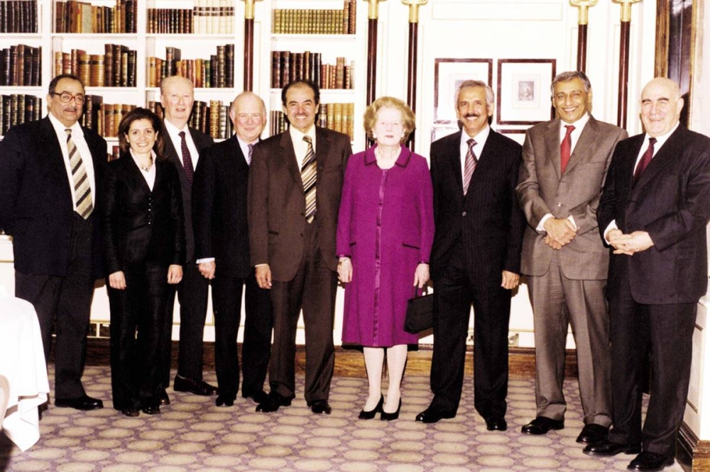 الراحل حمد الصقر مع وفد البنك الوطني خلال اجتماعه في بريطانيا، وتبدو رئيسة الوزراء الراحلة مارغريت تاتشر وناصر الخرافي وناصر السايرِ وإبراهيم دبدوب والسفير خالد الدويسان