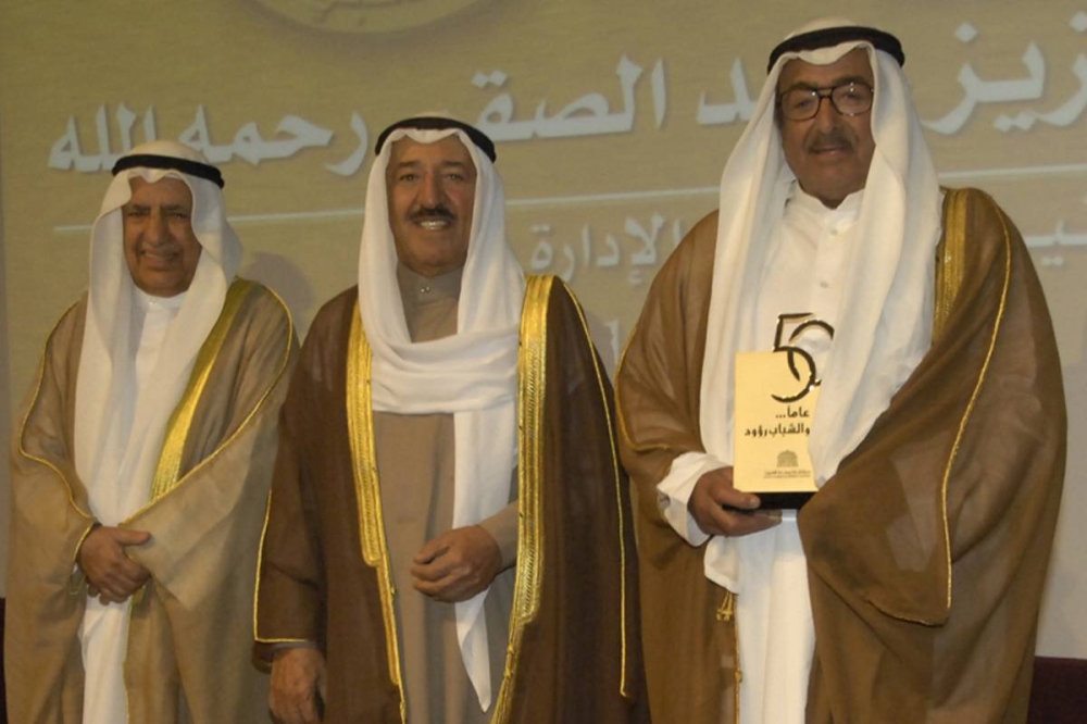 الراحل حمد الصقر مع الأمير الراحل وعلي الغانم خلال الاحتفال باليوبيل الذهبي لإنشاء غرفة التجارة والصناعة