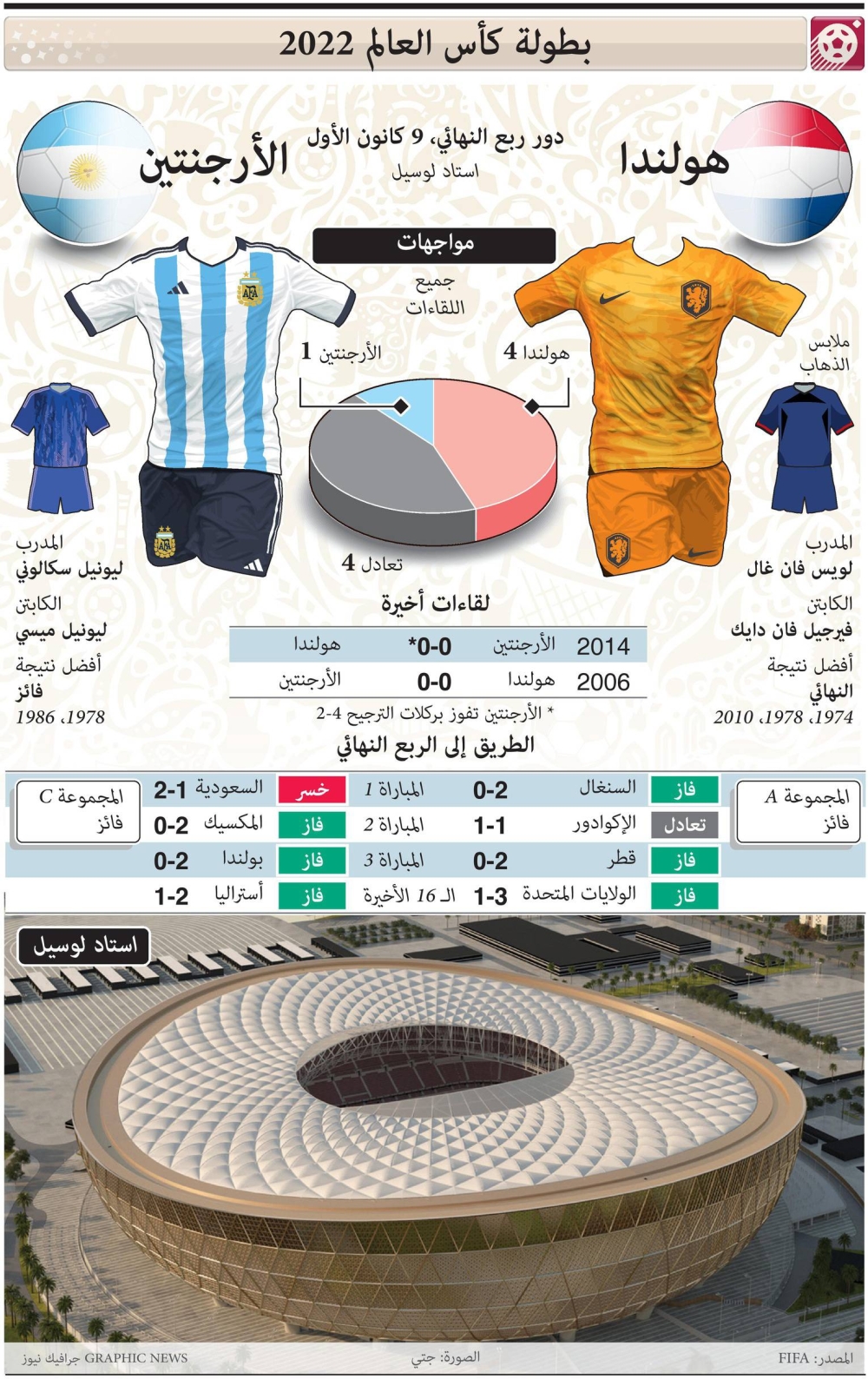 ويتطلع منتخب هولندا للثأر من خسارته أمام الأرجنتين بركلات الترجيح في آخر مواجهة جرت بينهما بكأس العالم، في الدور قبل النهائي بنسخة 2014 في البرازيل، حيث كان فان غال يتولى حينها قيادة المنتخب الهولندي.