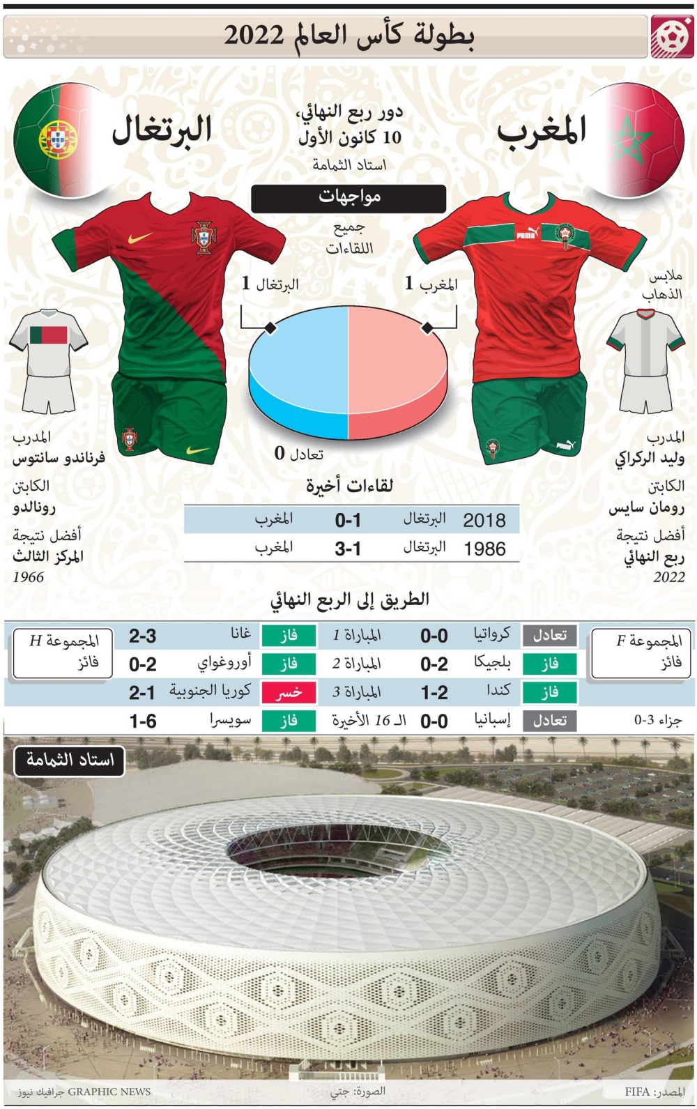 يسعى المنتخب المغربي إلى الاستمرار في كتابة التاريخ عندما يلتقي نظيره البرتغالي مساء غد السبت، في منافسات الدور ربع النهائي من بطولة كأس العالم المقامة حالياً في قطر، وكان المغرب فجر مفاجأة من العيار الثقيل عندما أقصى المنتخب الإسباني بطل العالم 2010 في الدور ثمن النهائي بركلات الترجيح، ليكتب بذلك تاريخاً جديداً له وللمنتخبات العربية بعد بلوغ السعودية (1994)، والجزائر (2014) ثمن النهائي سابقاً.